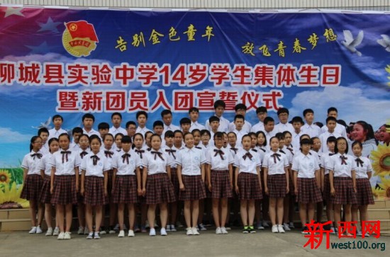 【新西网6月7日新闻·通讯员 唐惠媛】14岁,是加入共产主义青年团的法定年龄,是告别童年,走进青春之门的重要时间节点,为了隆重纪念这个有意义的时刻。6月2日下午,由共青团柳城县委、柳城县实验中学团委、柳城县人民检察院共同举办的“告别金色童年,放飞青春梦想”迈入青春门——14岁学生集体生日庆祝仪式在实验中学举行,共600多名中学生共同庆祝14岁生日,一批年满14岁的优秀学生正式加入共青团,告别金色的童年,迈进14岁的青少年行列。
