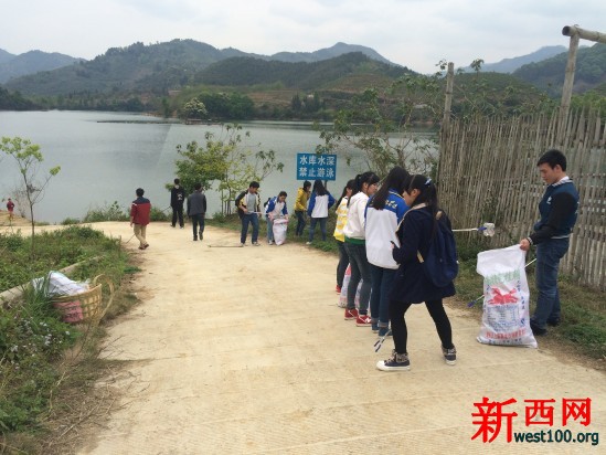 【新西网4月4日新闻·通讯员 龙 婕】3月22日—28日是第二十九届“中国水周”,为进一步提高群众关心水、爱惜水、保护水和水忧患意识,凤山县希望公益服务中心组织西部计划志愿者、凤山县高级中学学生共49人前往乔音水库开展“爱水护水•我们在行动”清洁库区活动。 活动当天,志愿者分成 2个小组,分别从两条路线开展库区周边垃圾清洁工作,一路上吸引了许多过往群众围观,尤其是志愿者背上带有“垃圾不乱扔,举止显文明”宣传标语的背篓更是引爆眼球,极大地扩大了活动的宣传效果。其中有位大伯还主动前来与志愿者交谈并积极参与其中。会师水库后,志愿者们还围绕“水”玩起了成语接龙等小游戏,寓教于乐。