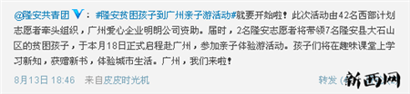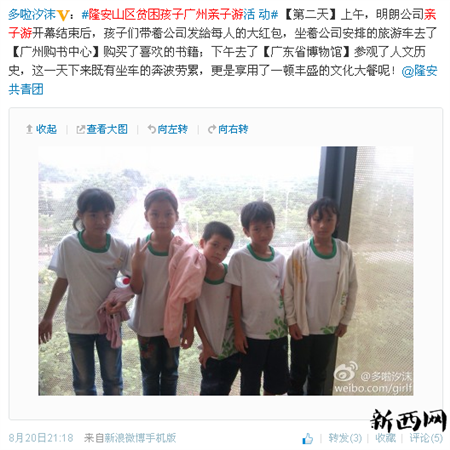 隆安共青团第六届“广西隆安县山区贫困孩子广州亲子游活动”微博图文记录 前期准备 活动前,志愿者开展入村家访,确定参加活动的孩子名单(一) 活动前,志愿者开展入村家访,确定参加活动的孩子名单(二) 隆安共青团官微活动预告(一) 隆安共青团官微活动预告(二) 到达广州的第一晚,孩子们在志愿者的带领下玩起游戏,很快就相互熟识起来 亲子游活动的启动仪式上,孩子们写下心中的梦想,有的要当老师,有的要当医生,还有的要当美食家…… 启动仪式结束后,孩子们在志愿者和明朗公司工作人员的带领下,开始广州之行。 第一站:购书中心,他们拿着明朗公司派发的120元购书大礼包,购买了自己最喜欢的课外书籍,还带给姐妹朋友好几本 第二站:广州琶洲会展中心 志愿者带孩子们来到南国书香节,他们在抽奖活动中玩得不亦乐乎,中了很多文具小奖品,也看了很多爱看的书 第三站:大夫山公园骑车活动 孩子们相互比赛追逐,亲近自然,玩得很开心 活动第四天行程:明朗公司参观并排练节目 为迎接明朗公司24日举行的晚会,小朋友们参观了明朗公司展厅,在明朗公司员工的指导下排练了一个模特走秀的节目,第一次参加演出、第一次化妆、第一次走秀的小朋友们都觉得非常新奇。 活动第五天:晚会演出圆满成功,小朋友的节目获得热烈掌声 广州亲子游活动结束后,每位小朋友都获得了明朗公司500元的资助经费。 |