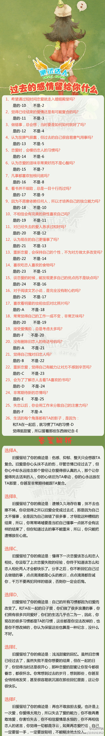 【过去的感情留给你什么呢?】每个人一生中都会有多次恋情,那么你是爱得死去活来,还是草草的就结束了这段恋情,那么到底旧爱在你心中留下了什么,让你无法忘怀,还是你并不记得你们之间曾经的美好回忆。你过去的一段感情留给你什么呢?(测试如图)